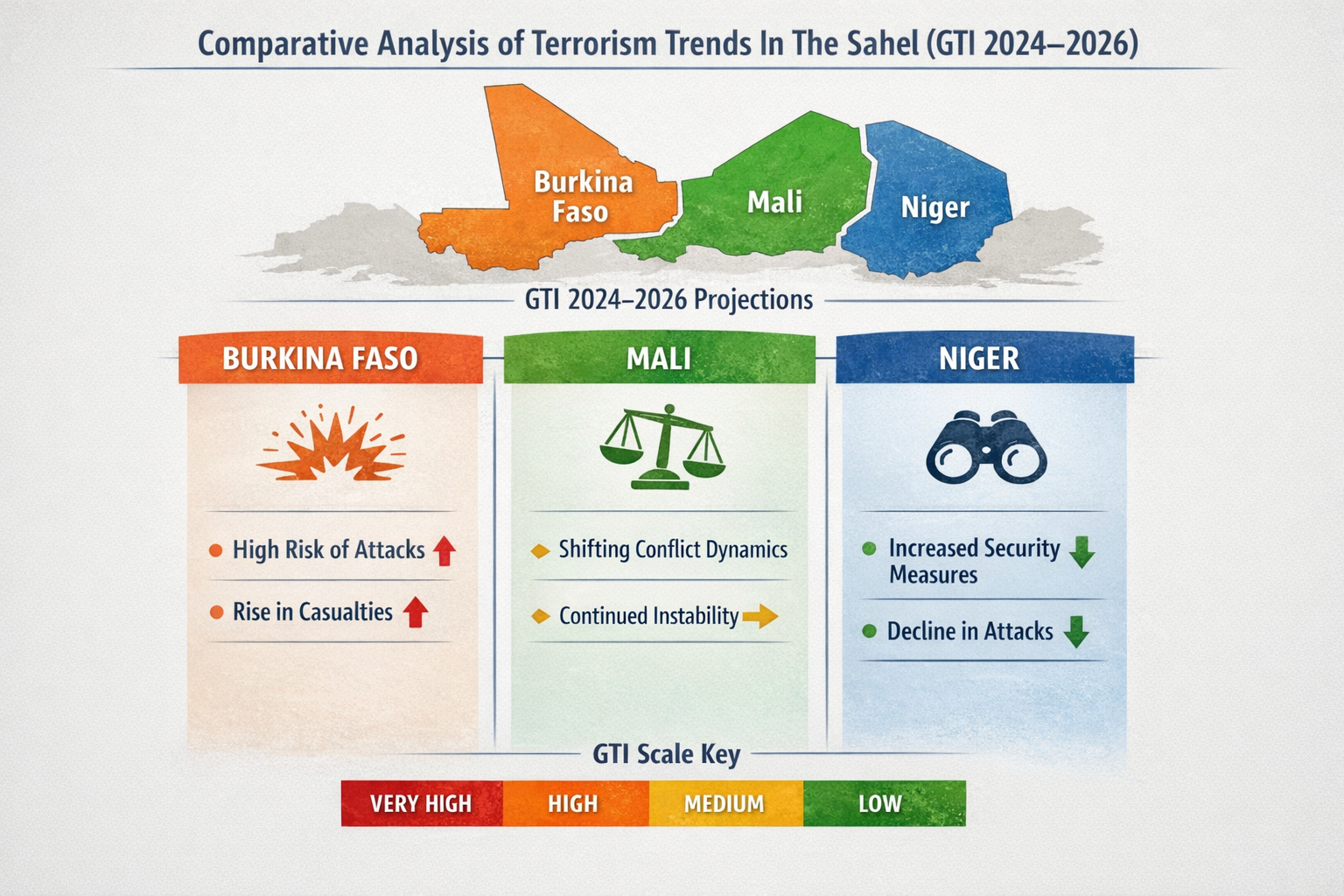 The comparative analysis of GTI 2024–2026 reveals a transition from expansion to fragile containment of terrorism. While the overall number of attacks and deaths has declined, the threat has become more concentrated, structurally embedded, and regionally complex. The Sahel remains the epicentre of global terrorism, and the persistence of underlying drivers such as weak governance and economic hardship suggests that recent gains may not be sustainable. Without sustained investment in governance, development, and international cooperation, there is a significant risk that terrorism could resurge in the coming years (Institute for Economics & Peace, 2024; 2025; 2026).